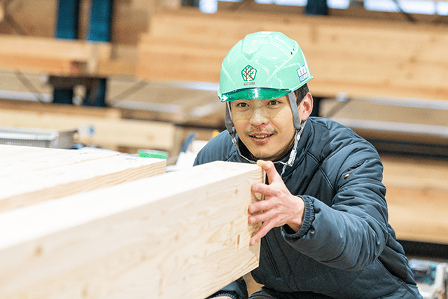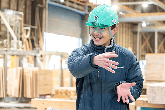 すさみ町の新しい庁舎のような大規模なプロジェクトに携わることもあり、自分の関わった建物が形になった時の達成感は格別です。 製材部と同じ敷地内に工場があるため、材料の性質をすぐに確認できるのが強み。部署の垣根がなく、チームで家づくりを支えている実感が持てる職場です。