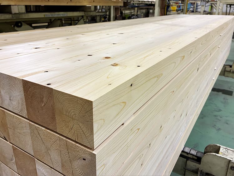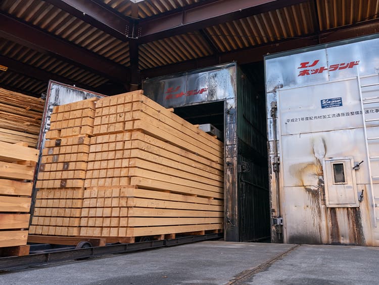 原木の受け入れから製材までを自社で一貫して行っています。 まず原木を厳選し、用途や品質基準に応じた選別を実施。その後、皮剥き工程を経て、乾燥工程へと進みます。 乾燥は、木材の品質を左右する重要な工程です。木の状態を見極めながら、適切な時間と方法で含水率を調整します。 十分に乾燥させた木材を製材し、用途に応じた寸法・品質で仕上げることで、安定した建材供給を実現しています。